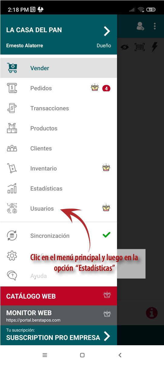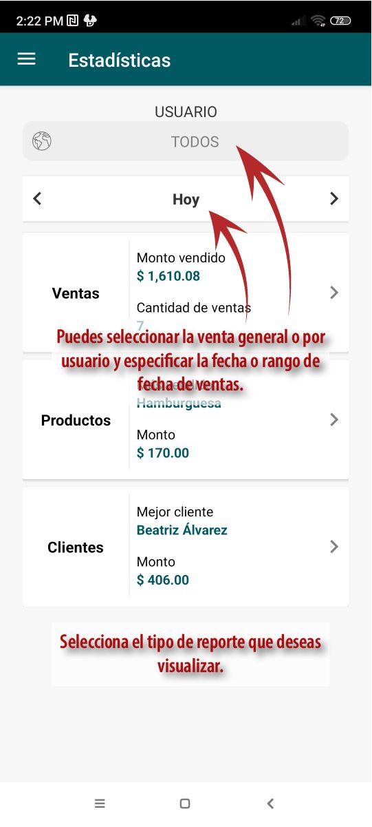 de estadística, puedes filtrar tus ventas por fecha o por usuario para obtener